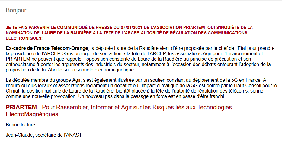 LAURE DE LA RAUDIERE A LA TETE DE L’ARCEP Animaux Sous Tension2021-02-08T11:38:06+01:00février 3rd, 2021|AUTRES DEBATS| Share This Post FacebookTwitterLinkedInPinterest Articles similaires l’ANAST PARTICIPE 0 UNE AUDIENCE DE l’OPECST RÉACTION DE L’A.N.A.S.T SUITE ARTICLE DE CÉCILE ROSSIN « jrnl L’ÉCLAIREUR »